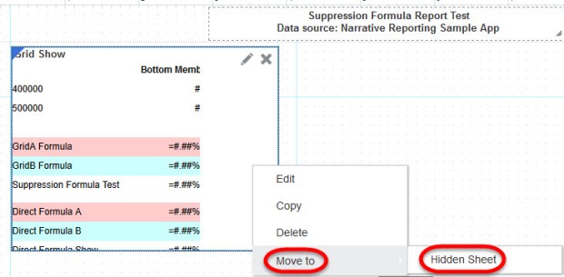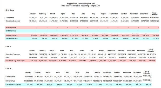 As you can see, the data is suppressed in the cells of the top formula set, which “cell references” the calculated formulas from the individual grids. This is not how it should behave. Grids A and B do have suppression set on them, but there is calculated data in the cells being referenced, and it’s actually showing. Therefore, the data should not be suppressed in “Grid Show”.
