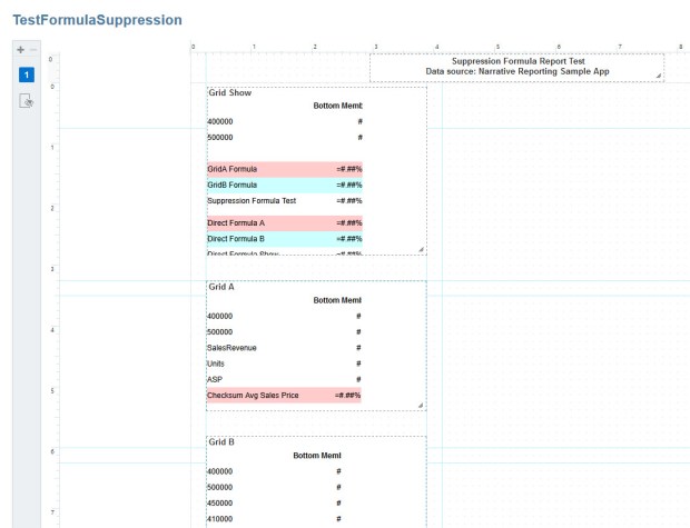 The purpose of this report is to mimic the scenario where a customer wants to pull data from multiple sources together into multiple grids (most of which are hidden), and then consolidate to a single grid that’s shown to the user. In my case, I’m using the sample Narrative Reporting application as the data source of all three (which has no bearing on the bug), just to keep it simple and replicable.