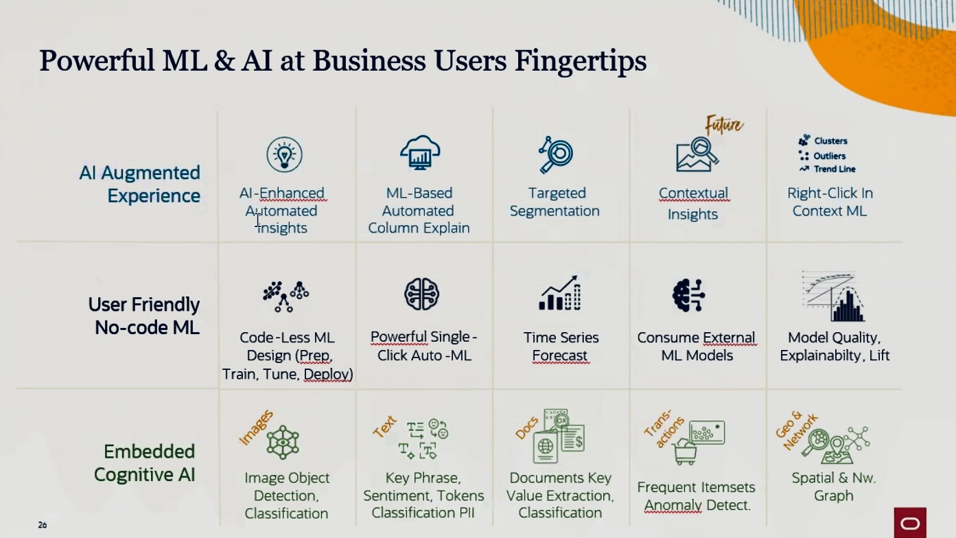 - Embedded Cognitive AI: advanced AI in an easy and fun way with no ML training necessary. And you apply AI to your data flows in Oracle Analytics.