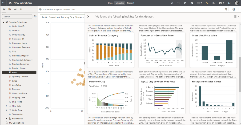 - AI Augmented Experience: created with the end user in mind—these are features that give the user proactive insights about their data, in various forms. For example, as you load up your data in Oracle Analytics, it will automatically be introspected. Meaningful insights will proactively be presented to you as you start building new visualizations. This is the Auto Insights capability of Oracle Analytics.