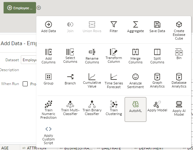 - User Friendly No-code ML: also created for business users with no technical background, this feature has a user interface (“UI”) in Oracle Analytics that allows users to design and apply regressions, forecasts, classifications, etc. The “Auto ML” capability allows a user to tell the platform what they want to predict and it will return with an optimal model to deliver their prediction request: