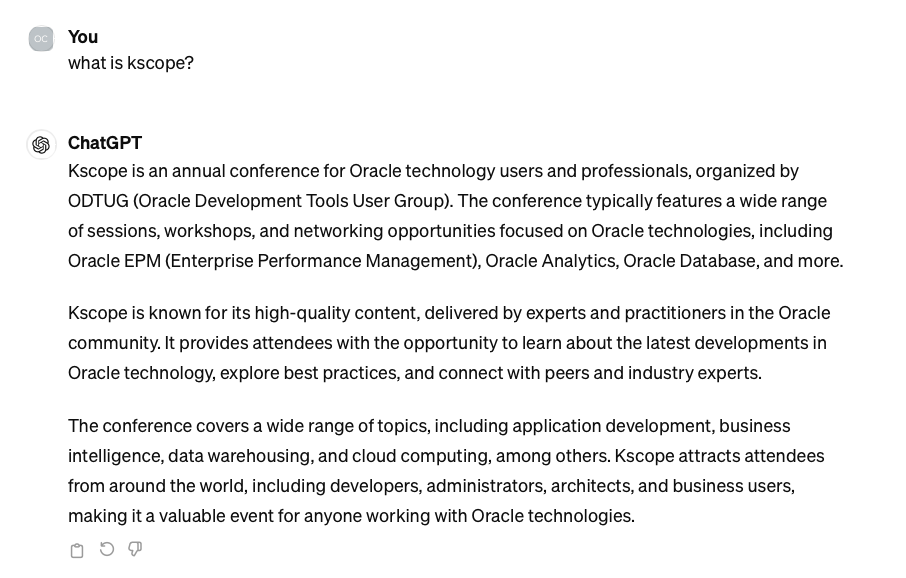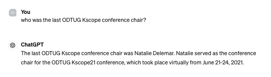 The information in that Kscope question was available on the internet. I could find it after human-sifting through Google’s results. Hmmm…so wouldn’t Google give you the right answer? Can’t ChatGPT just google time-sensitive requests?