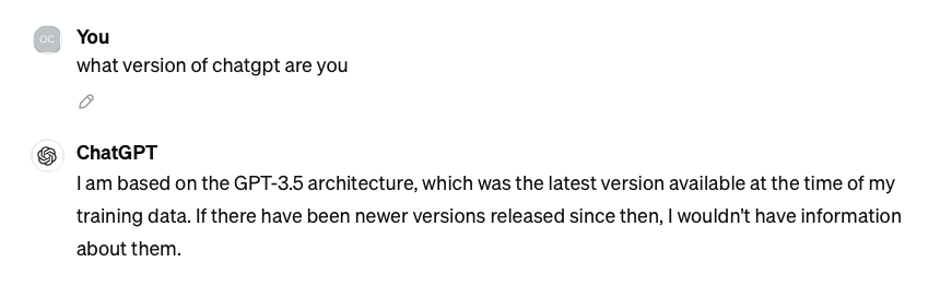 Silly ChatGPT. But now you can understand how hit and miss this technology can be. You have to know and remember the time boundaries of when the tool was trained.