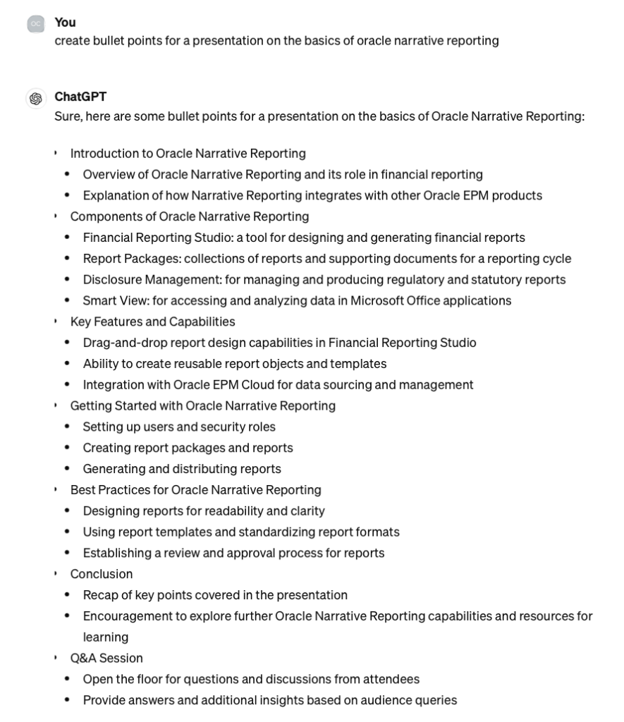 Finally, I gave ChatGPT the ultimate test. I had it write from scratch an outline of a Narrative Reporting session I submitted for Kscope24 that was accepted. How would ChatGPT’s version compare to my 100% human generated version?