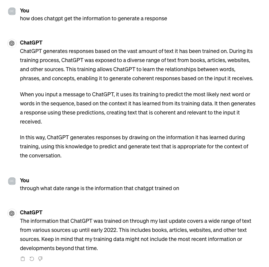 Now that we’ve interrogated ChatGPT about itself, let’s move onto some control questions. The first thing I did was ask some basic questions to understand where ChatGPT might or might not have limitations to its knowledge.